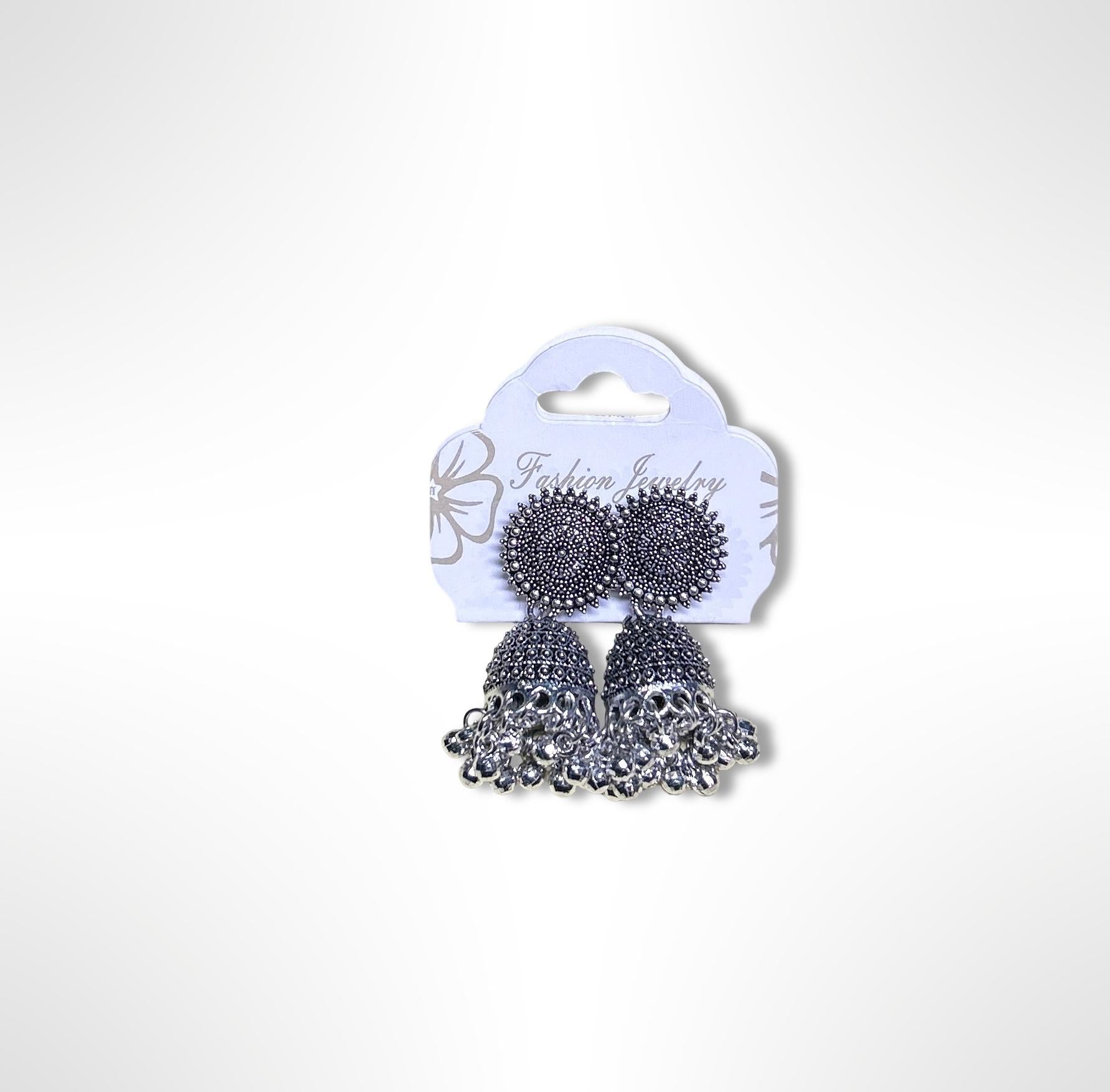 Add a touch of traditional Indian elegance to your look with these stunning oxidized silver jhumka earrings. Crafted with intricate details and a unique blue-green patina, these earrings are perfect for making a statement.